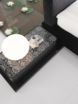 Еще одно интересное дизайнерское решение SMA design - диодная подсветка в пространстве между ящиками комодов и тумб, лицевая часть которых, по желанию клиента, обивается кожей либо экокожей в виде кожи каймана. В данной модели возможна установка закроватных панелей с подсветкой или с покрытием из лакированого стекла.