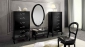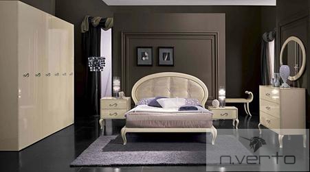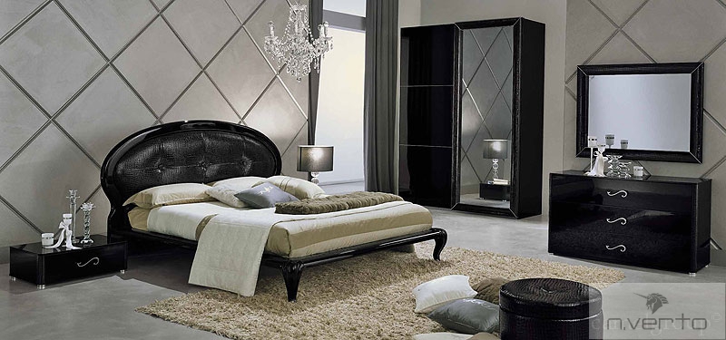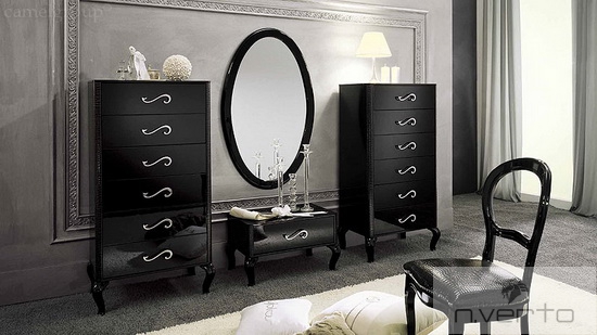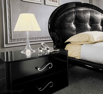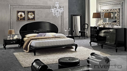 Cпальня: Кровать, зеркало и карнизы выполнены с отделкой из лакированной экокожи, полученной при помощи сложного технологического процесса. Ножки прикроватных тумб, кровати, комода, высокого комода модели MAGIC выполнены в стиле барокко и изготавливаются из массива бука в отделке блестящий черный лак.